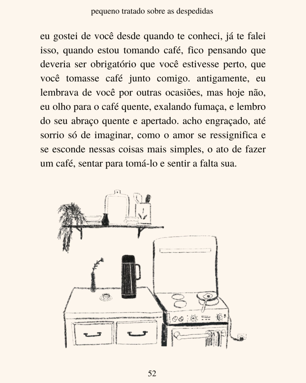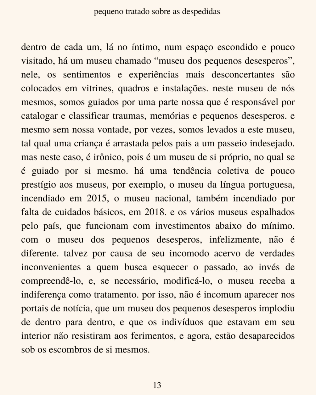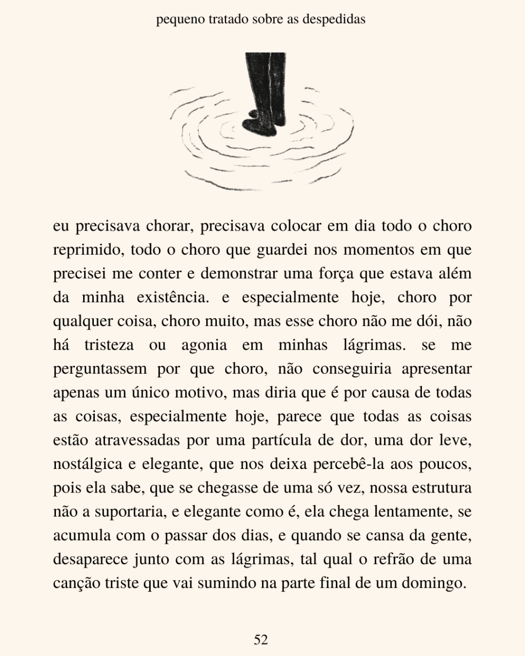 com linguagem simples, delicada e marcada pela sensibilidade, o pequeno tratado sobre as despedidas, nova obra de kaio bruno dias, vasculha as miudezas do cotidiano e da vida prosaica, para falar da ausência, da perda, da saudade, da solidão, dos desencontros amorosos, do vazio existencial, da curta duração da vida e da contínua necessidade de seguir em frente, mesmo sem saber ao certo para onde se está indo. os texto são estruturados em prosa poética e ilustrados em giz de cera pela artista visual marina dutra.